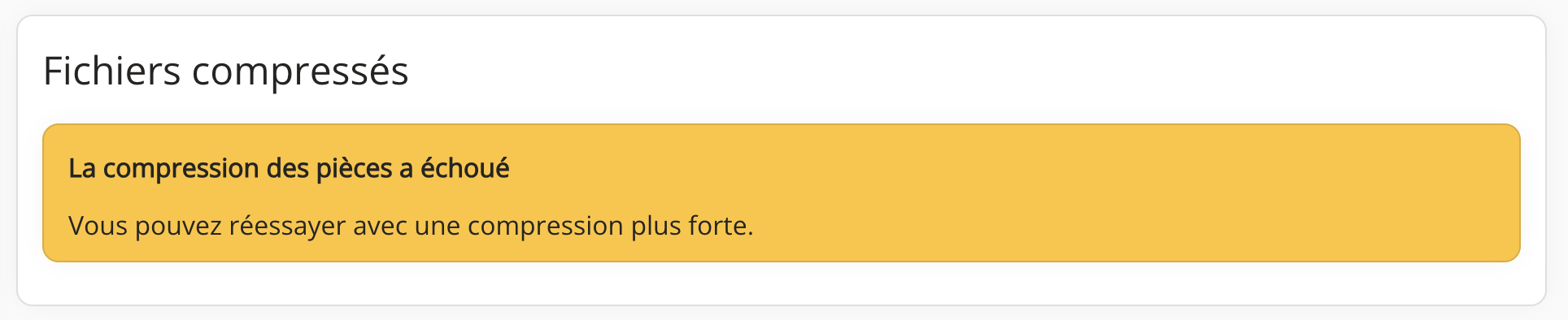 La compression de pdf est un processus complexe qui n'abouti pas toujours, si la compression a échouée, vous en êtes avertis et invité à réessayer avec une compression plus forte.